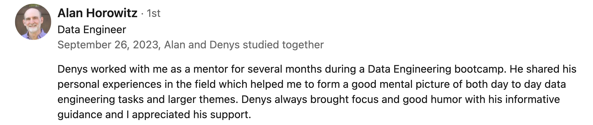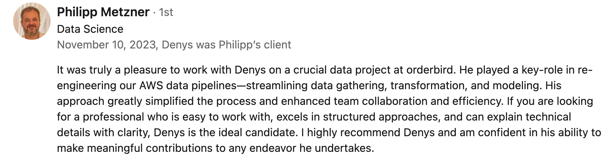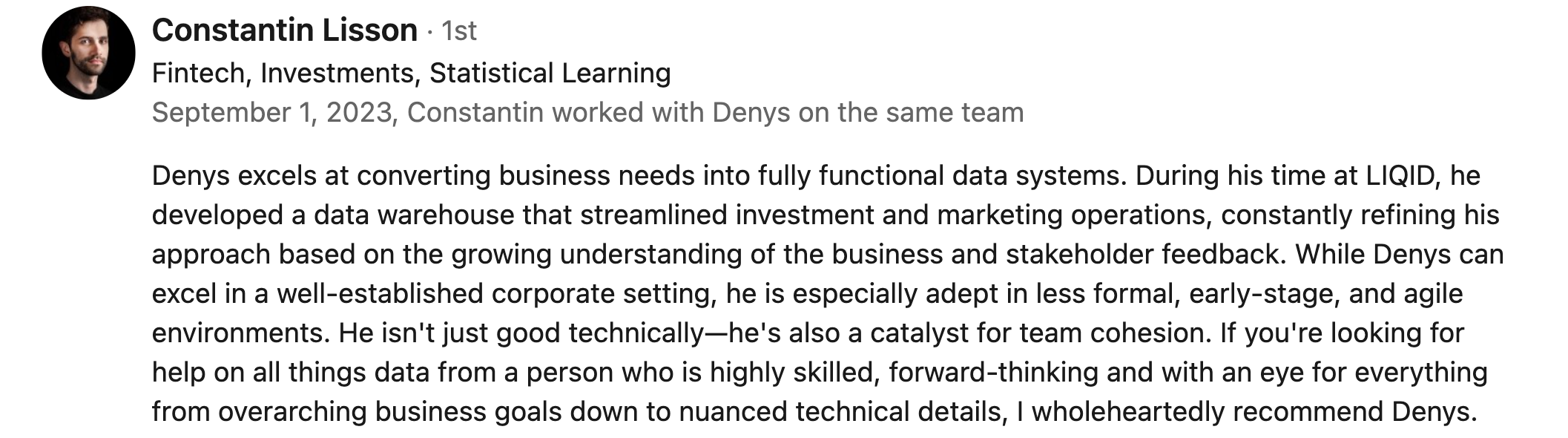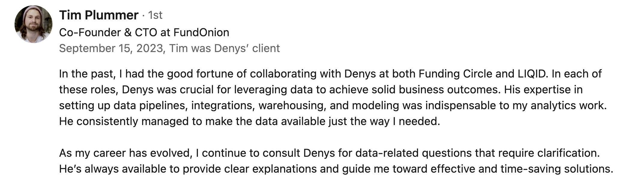 After working with more than a dozen companies, building numerous data platforms, from working with boring batch CRM data to working with slightly more exciting real-time data facilitating autonomous driving features, from working for companies ranging from dynamic one-person to much more boring hundreds of thousands, from individual contributor to team lead and people manager, I keep working at the intersection of what I enjoy the most—designing technical systems with a clear priority on human collaboration. There is still a lot for me to learn in both areas.