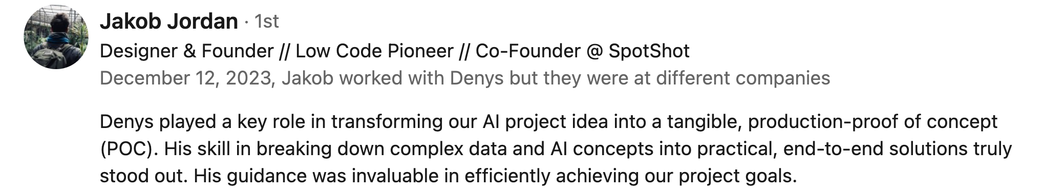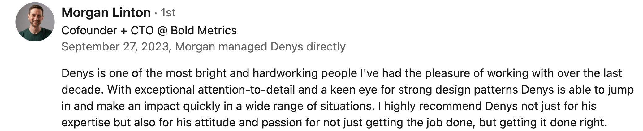 One of my biggest professional strengths comes from the sheer number of different companies, technologies, and team constellations I have worked with. This experience helps me make increasingly precise and effective decisions, both technical and interpersonal, when engaging in a new project.