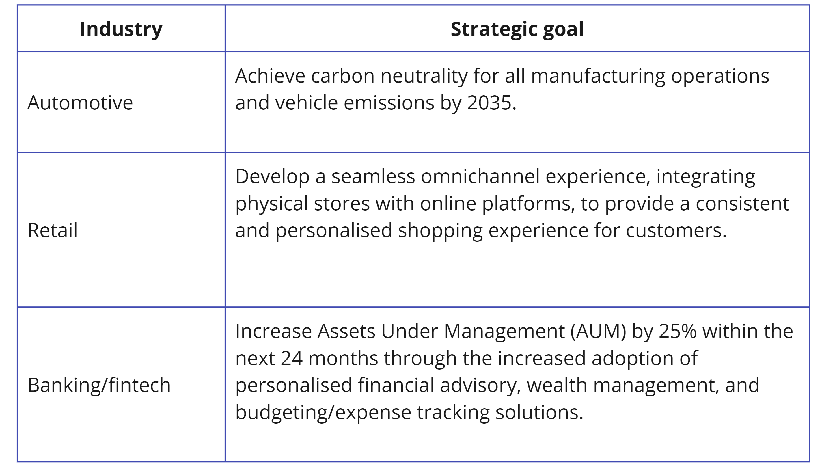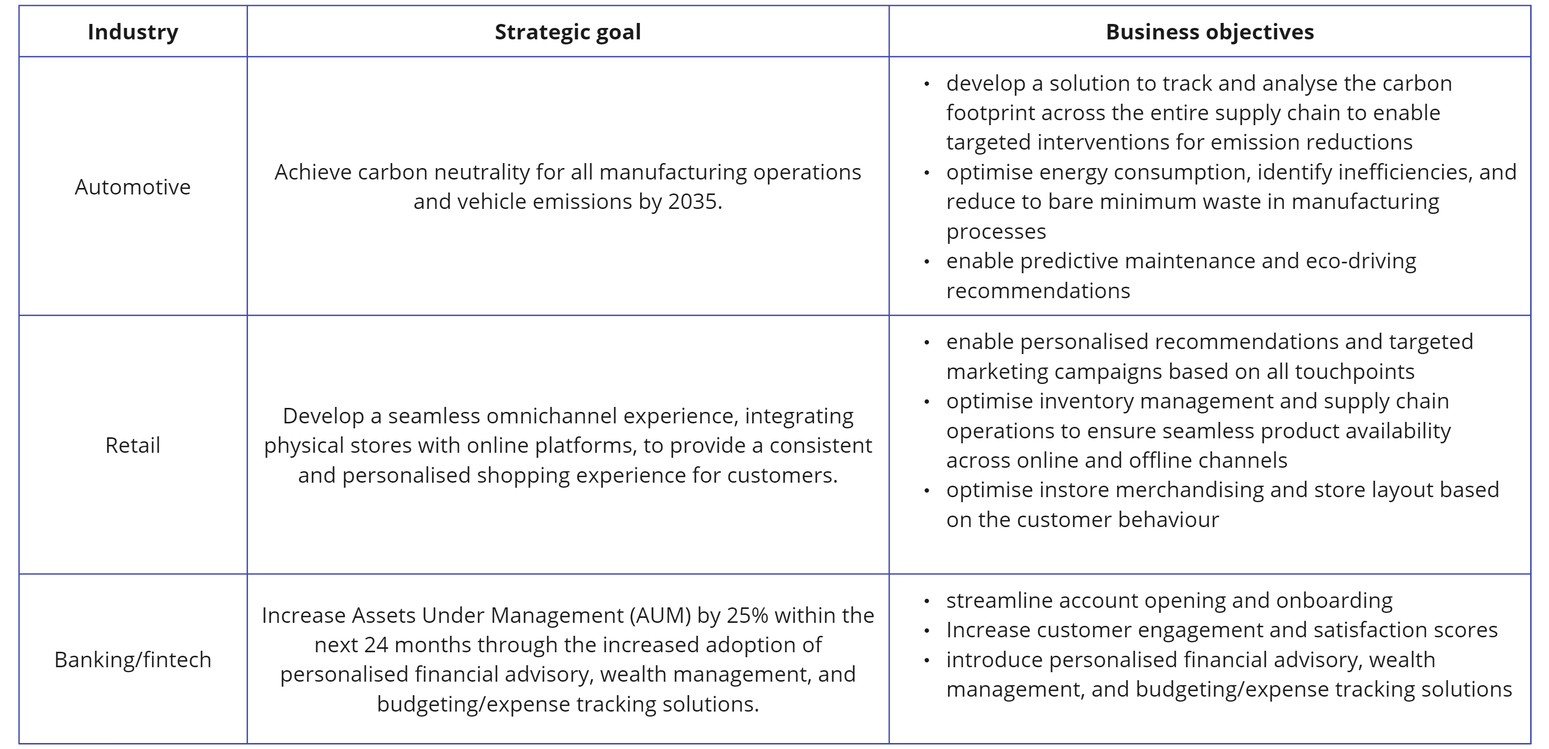 A successful data strategy starts with the business, its drivers, long-term vision and goals. Here are some examples:
