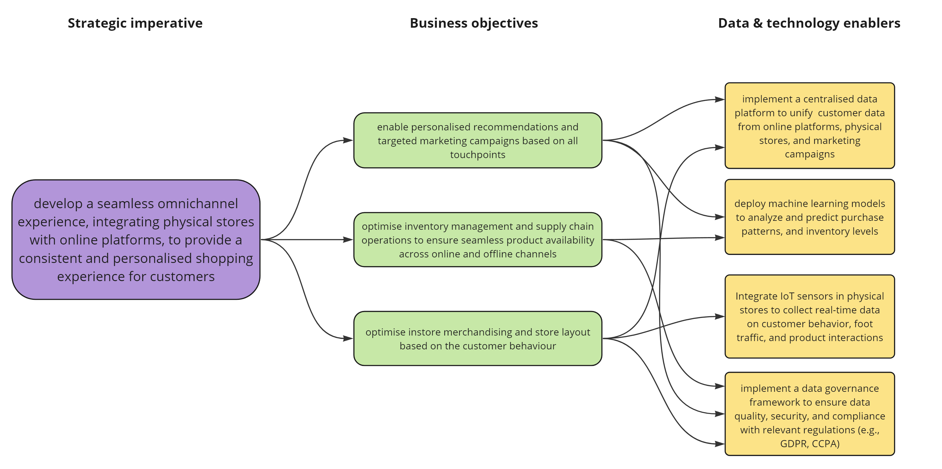 It is very important that this full hierarchy—from strategic imperatives down to enabling data/tech solutions—is transparently communicated across the organisation. This allows employees and departments to connect their day-to-day work back to the bigger picture strategic vision. By grounding a data strategy in the context of broader business objectives emanating from core strategic drivers, organisations can ensure their data and technology investments are purposefully aligned to key priorities. And openly sharing this top-down mapping builds critical organisational understanding and buy-in.
